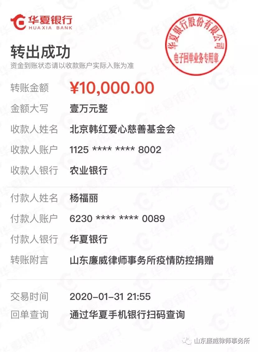 疫情之下,我们同呼吸共命运,为落实党中央和省、市司法局及律协关于做好新型冠状病毒感染的肺炎疫情防控工作的要求,支持武汉打赢新型冠状病毒感染的肺炎疫情防控硬仗,山东廉威律师事务所从自身做起,主动延长春节假期至正月十五以后,调整值班工作安排,积极投身到预防新型冠状病毒工作中,在所内成员向武汉疫区捐献口罩的基础上募得善款10000元,于1月31日向韩红爱心慈善基金会捐赠,以支援新型冠状病毒感染的肺炎疫情防控。