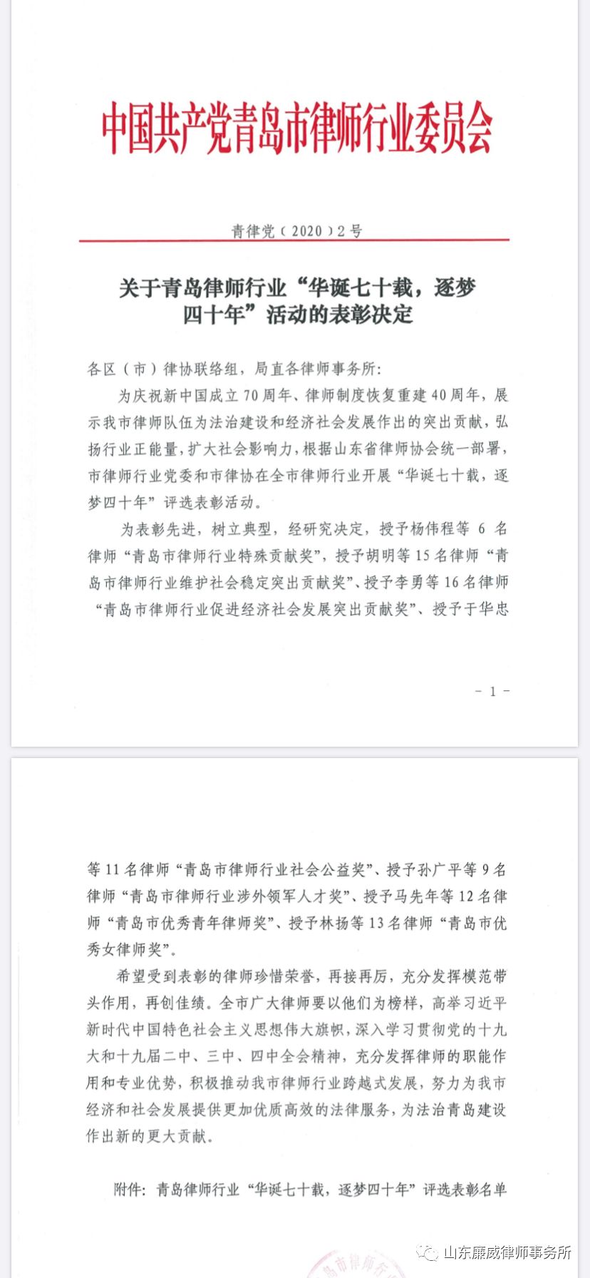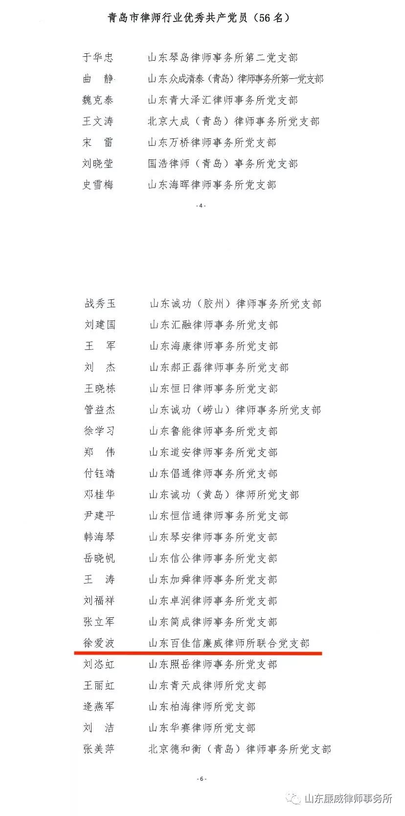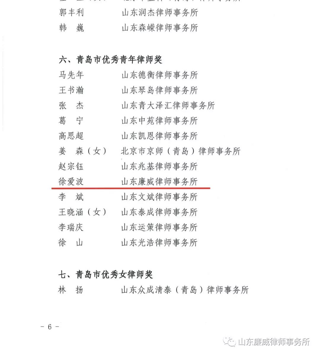 为表彰先进,树立典型,弘扬行业正能量,扩大社会影响力,市律师行业党委和市律协在全市律师行业开展“华诞七十载,逐梦四十年”评选表彰活动,我所徐爱波律师荣获“青岛市优秀青年律师奖”、“青岛市律师行业优秀共产党员”称号。